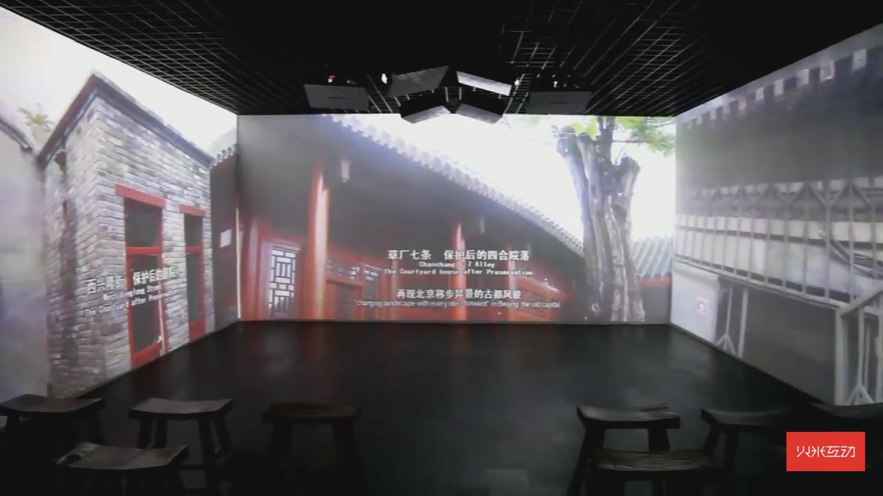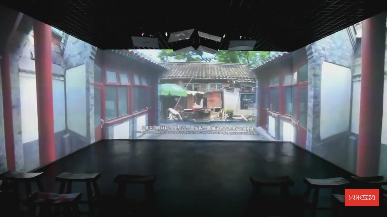 通過沉浸式三折幕投影展示了北京四合院的古都風(fēng)貌,再配上立體聲效,能夠有強(qiáng)力的視聽沖擊感。