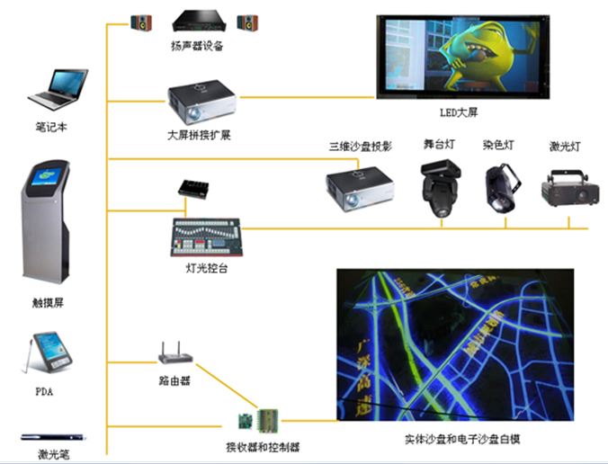 5、電子沙盤設有中央控制系統,包括總體控制,廳內照明、燈飾、計算機、電視機、操作臺以及空調等強弱電系統按照預先編制的運行程序自動運行,從開啟電源到并閉電源,都不需要人為控制,自動運行。